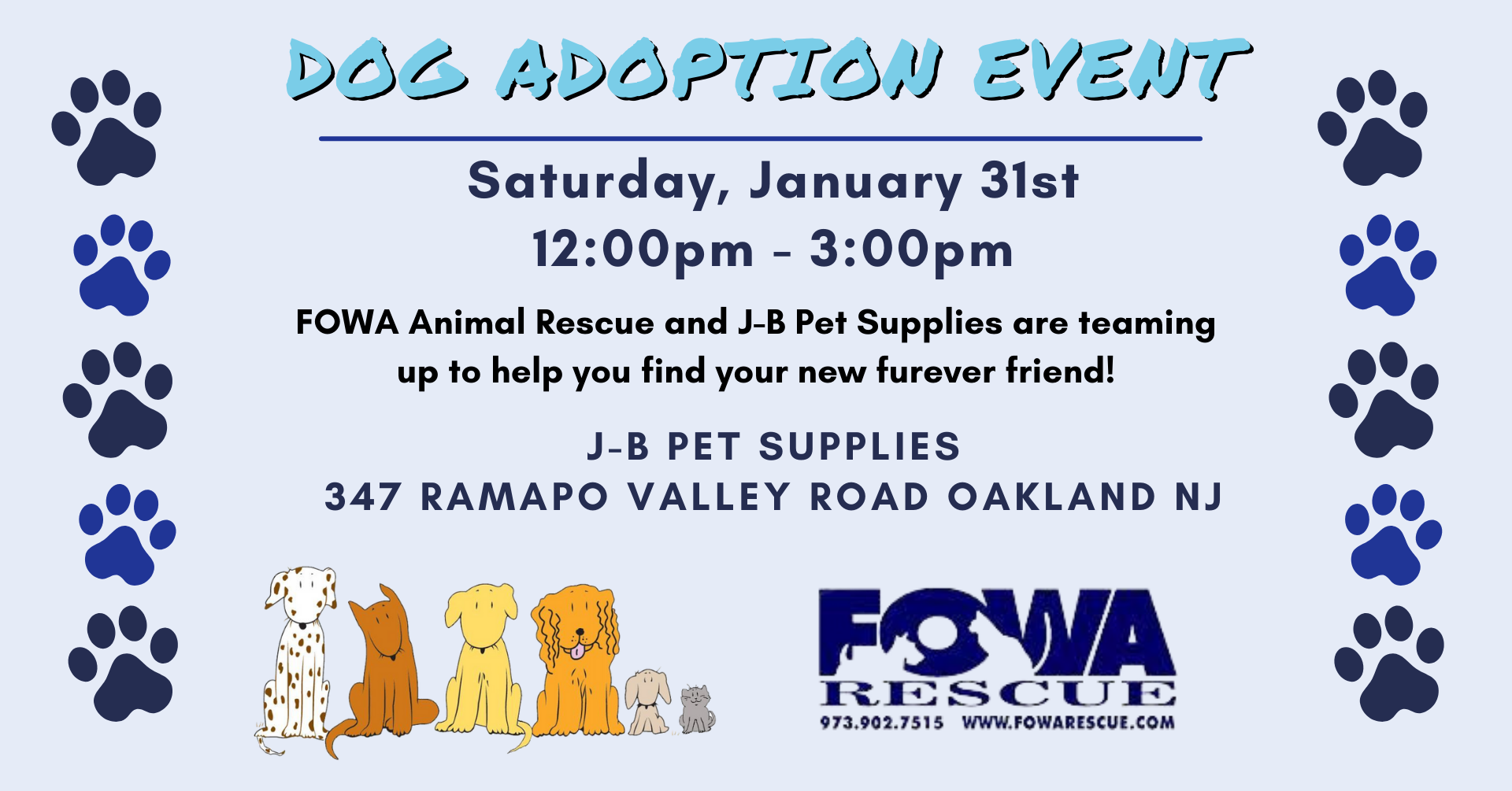 J-B Pet Supplies is happy to host Friends of Wayne Animal Rescue (FOWA). Stop into our Oakland Store and help one of the precious dogs find a new home. If you, or anyone you know, is looking to adopt dog please stop. Please spread the word to anyone who may be looking to adopt a new dog