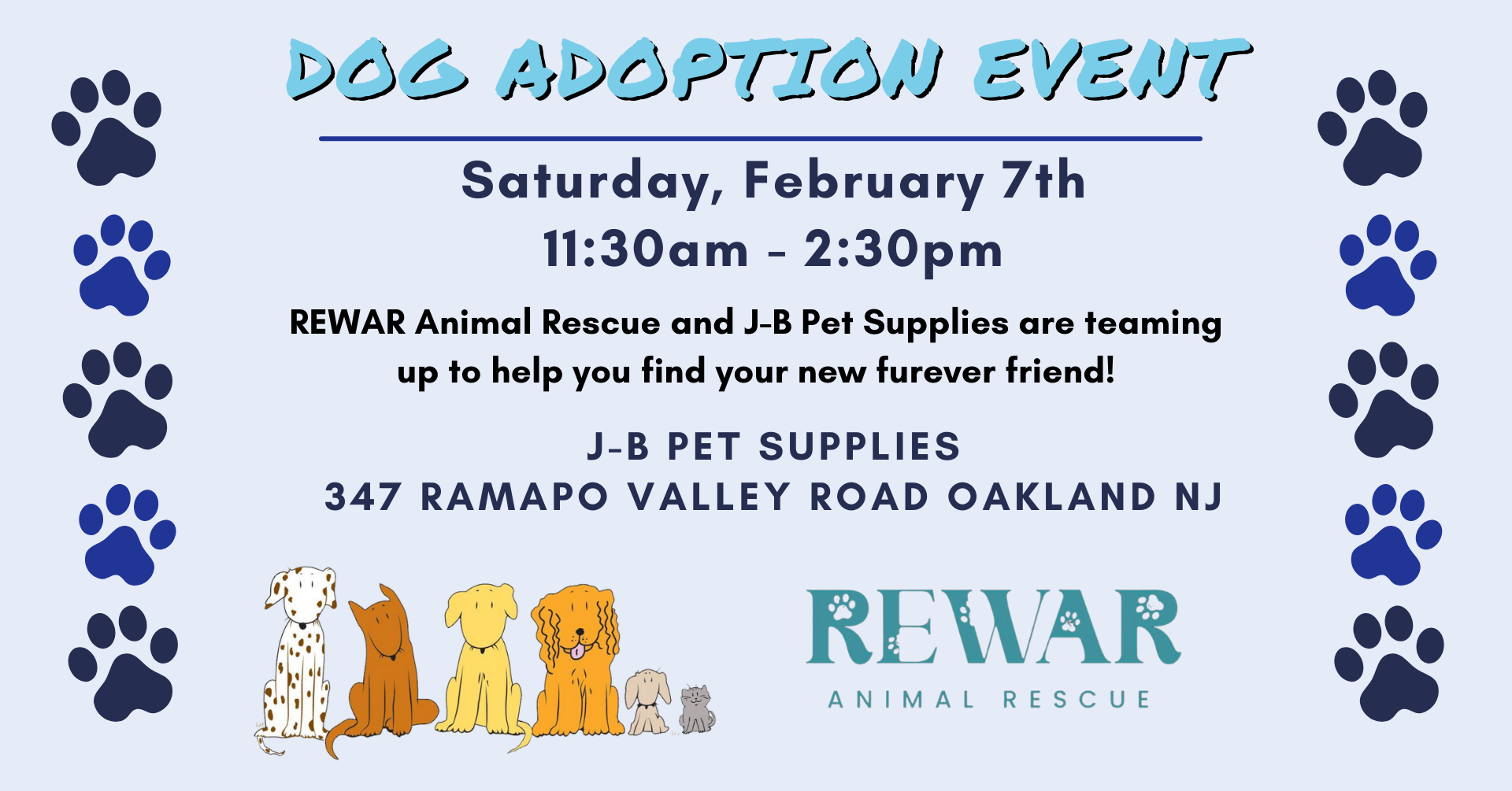 J-B Pet Supplies is teaming up with Rewar Animal Rescue to help you find your new furry best friend! They will be at the Oakland location with a bunch of puppies just waiting to find their forever home! For more information on the dogs or to get pre-approved, check out their website at https://www.rewar.org/